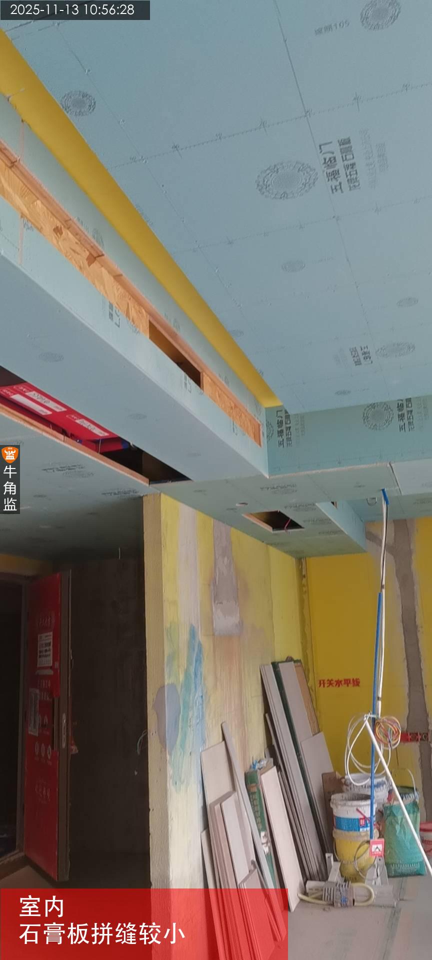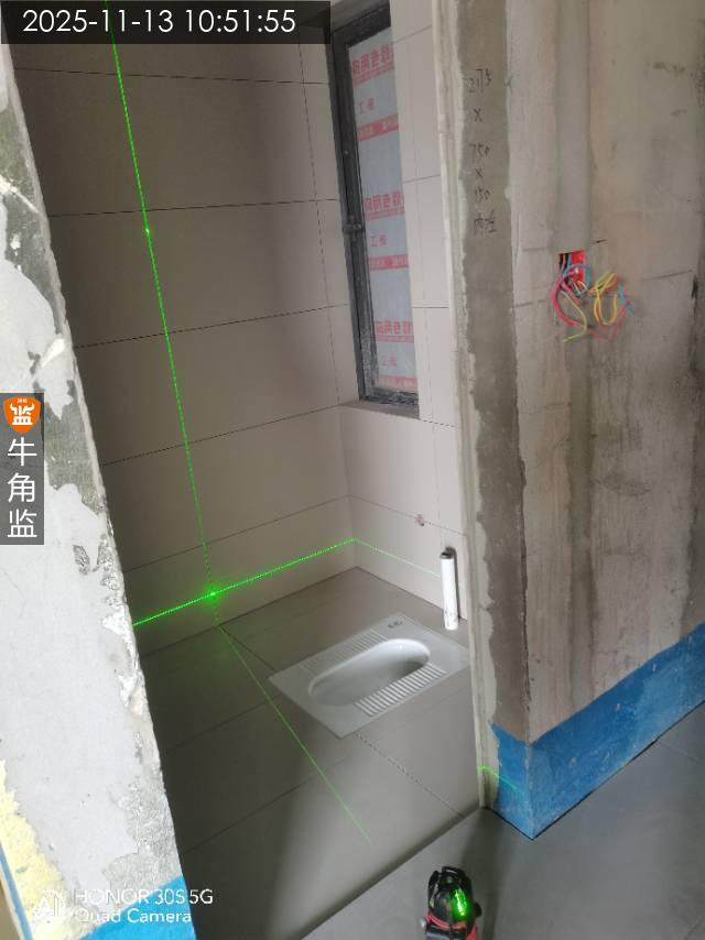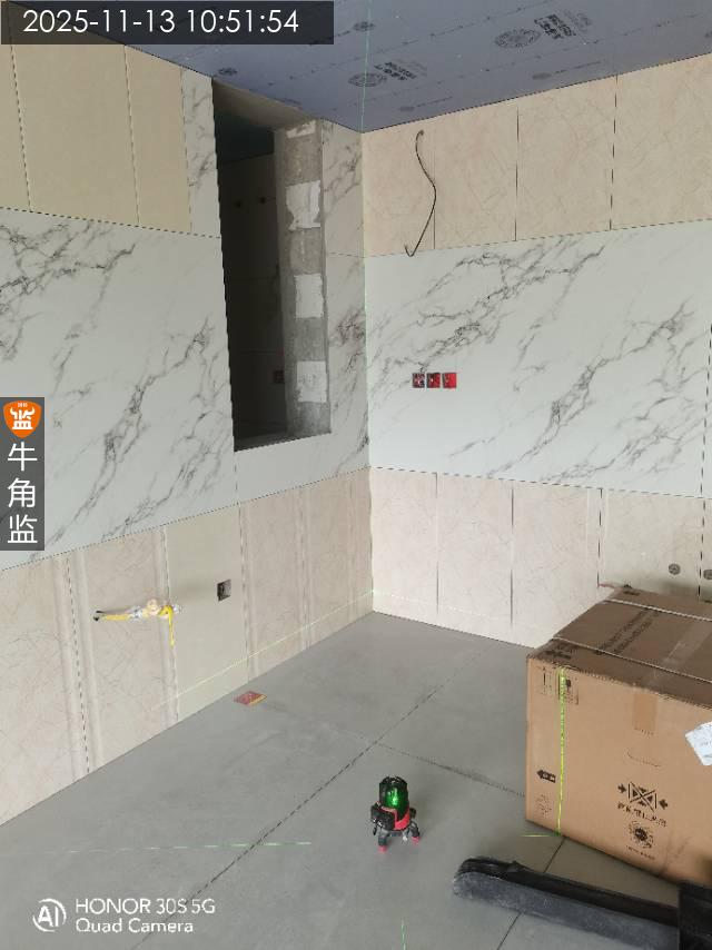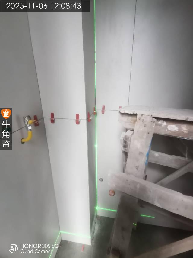 全屋地磚目前已鋪貼70%,廚、未前期已做48小時閉水試驗,兩個衛生間干區地面目前已鋪貼瓷磚,室內木工吊頂目前已完成70%,現場無人施工,下一步計劃為泥木持續施工