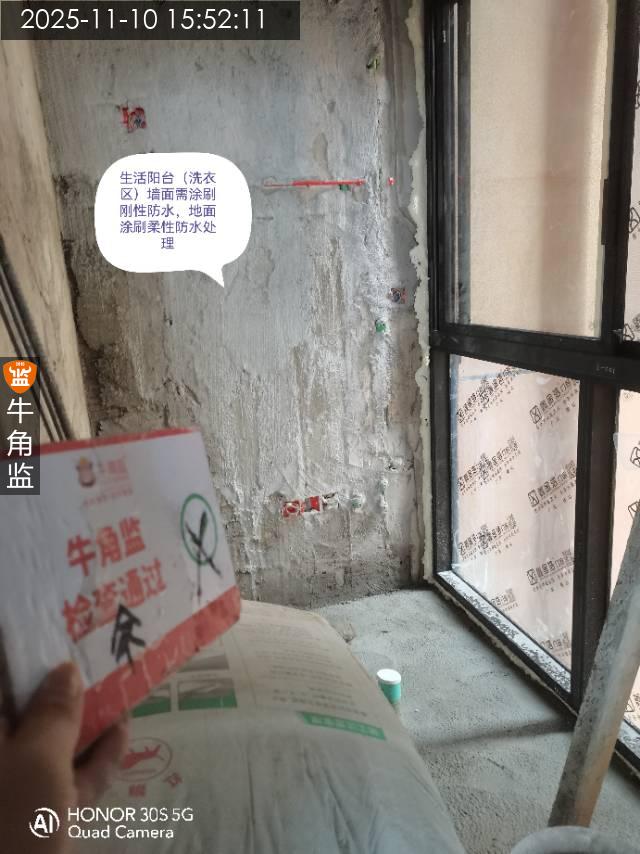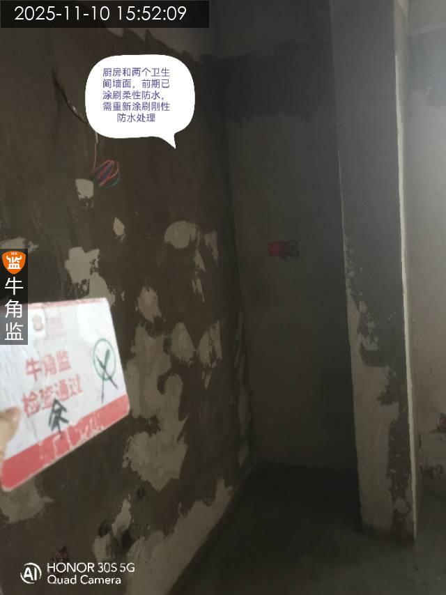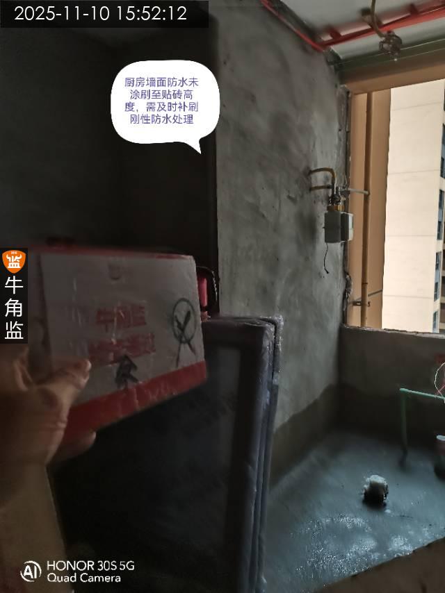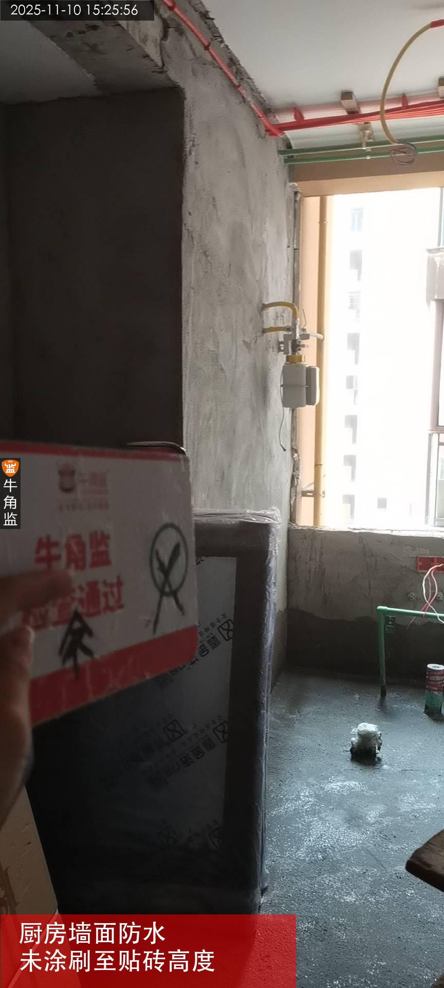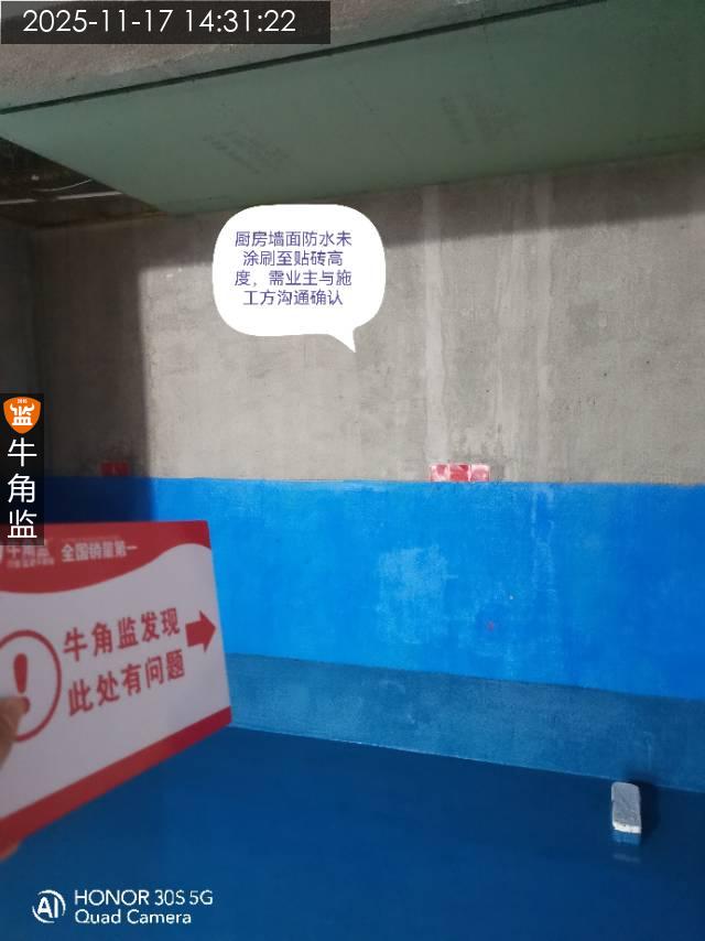 1.廚房墻面防水未涂刷至貼磚高度,需業主與施工方溝通確認