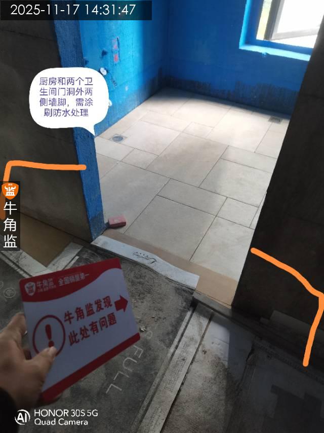 4.廚房和兩個衛生間門洞外兩側墻腳,需涂刷防水處理